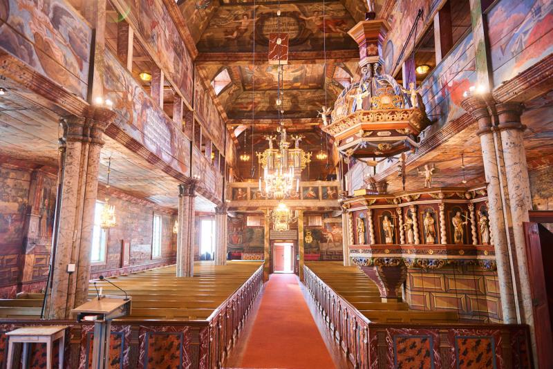 Ofta kallad “Träkatedralen vid Vättern” – känd för sina heltäckande bibliska vägg- och takmålningar.